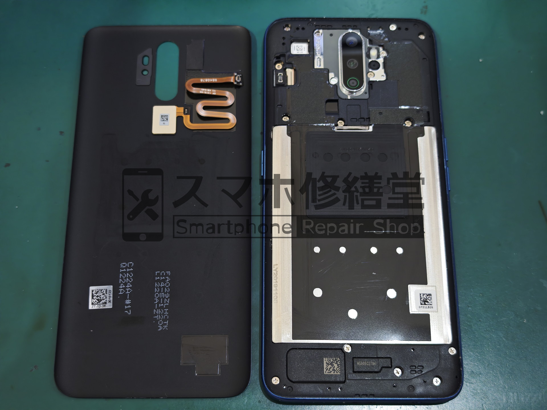背面カバーを取り外し内部へアクセスします。OPPO A5 2020は背面カバーと指紋センサーが一体となったフレックスケーブルで接続されているため、丁寧に分離する必要があります。